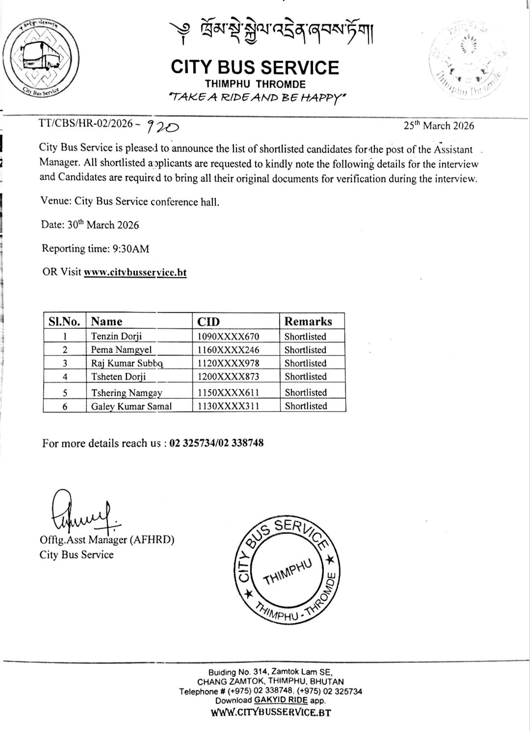 City Bus Service is pleased to announce the list of shortlisted candidates for the post of Assistant Manager (AFHRD).All shortlisted applicants are requested to kindly note the following details for the interview and Candidates are required to bring all their original documents for verification during the interview.